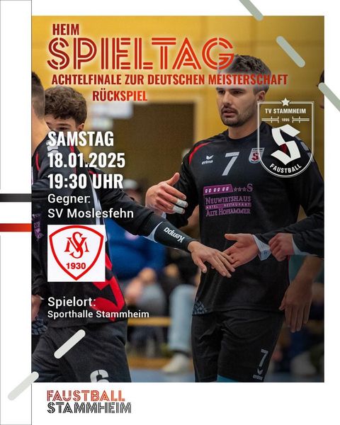 Für die Schwaben bedeutet dies, im Hinspiel, am 11. Januar 2025 (Spielbeginn 20:00 Uhr) reisen sie zum Gastspiel beim ca. 600 km entfernten SV Moslesfehn, während das Rückspiel des Achtelfinals am 18. Januar 2025 um 19:30 Uhr in unserer stammheimer Sporthalle stattfinden wird.