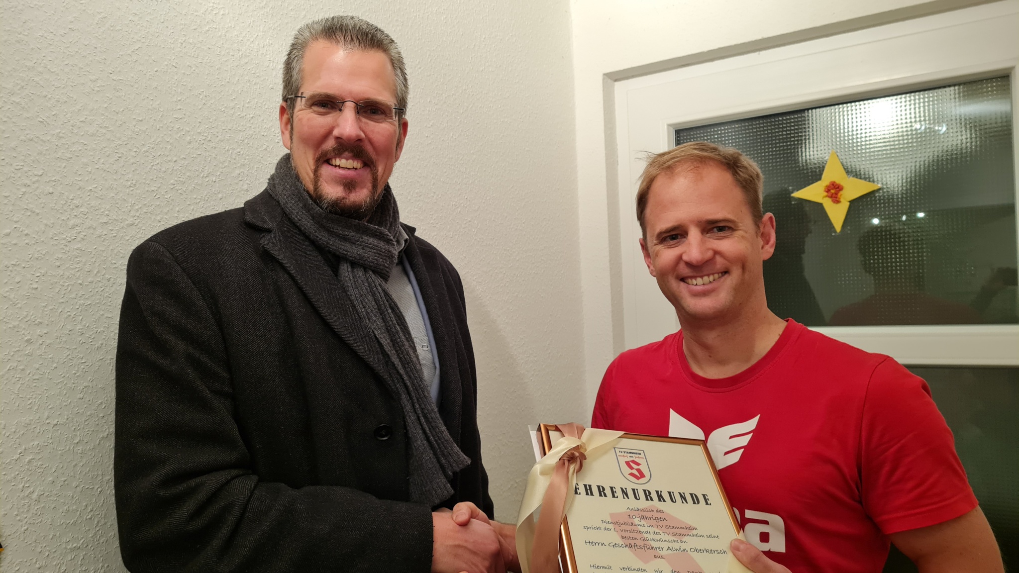In diesem Jahr freut sich der TV Stammheim über ein ganz besonderes Dienstjubiläum. So konnte der 1. Vorsitzende Thorsten Beck, den nunmehr seit 10 Jahren hauptamtlich tätigen Leiter der Kindersportschule (KISS) und TV-Geschäftsführer Alwin Oberkersch für sein berufliches Engagement beim TV Stammheim ehren.