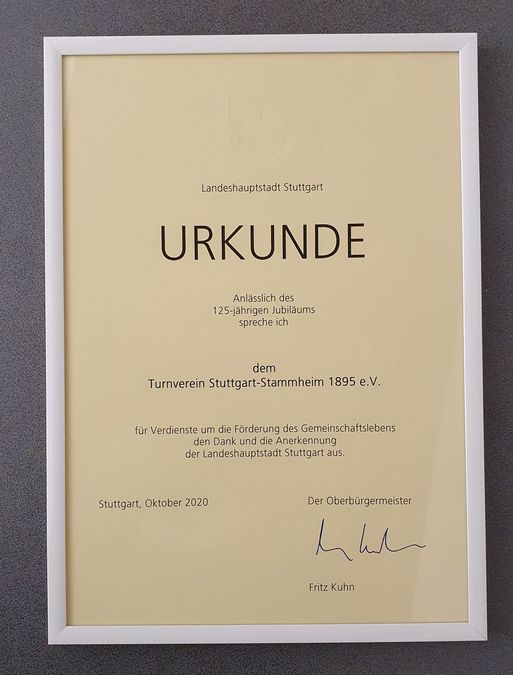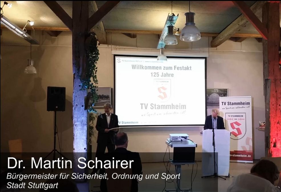 Trotz der Beschränkungen kam eine illustre Runde zusammen. So überbrachten der Bürgermeister für Sicherheit, Ordnung und Sport der Stadt Stuttgart, Dr. Martin Schairer nicht nur die Glückwünsche und ein Jubiläumsscheck in Höhe von 2500,-€, sondern stellte auch die Unterstützung in Aussicht, dass die Baugenehmigung für den Wiederaufbau der Turn- und Versammlungshalle bald erteilt werden soll.