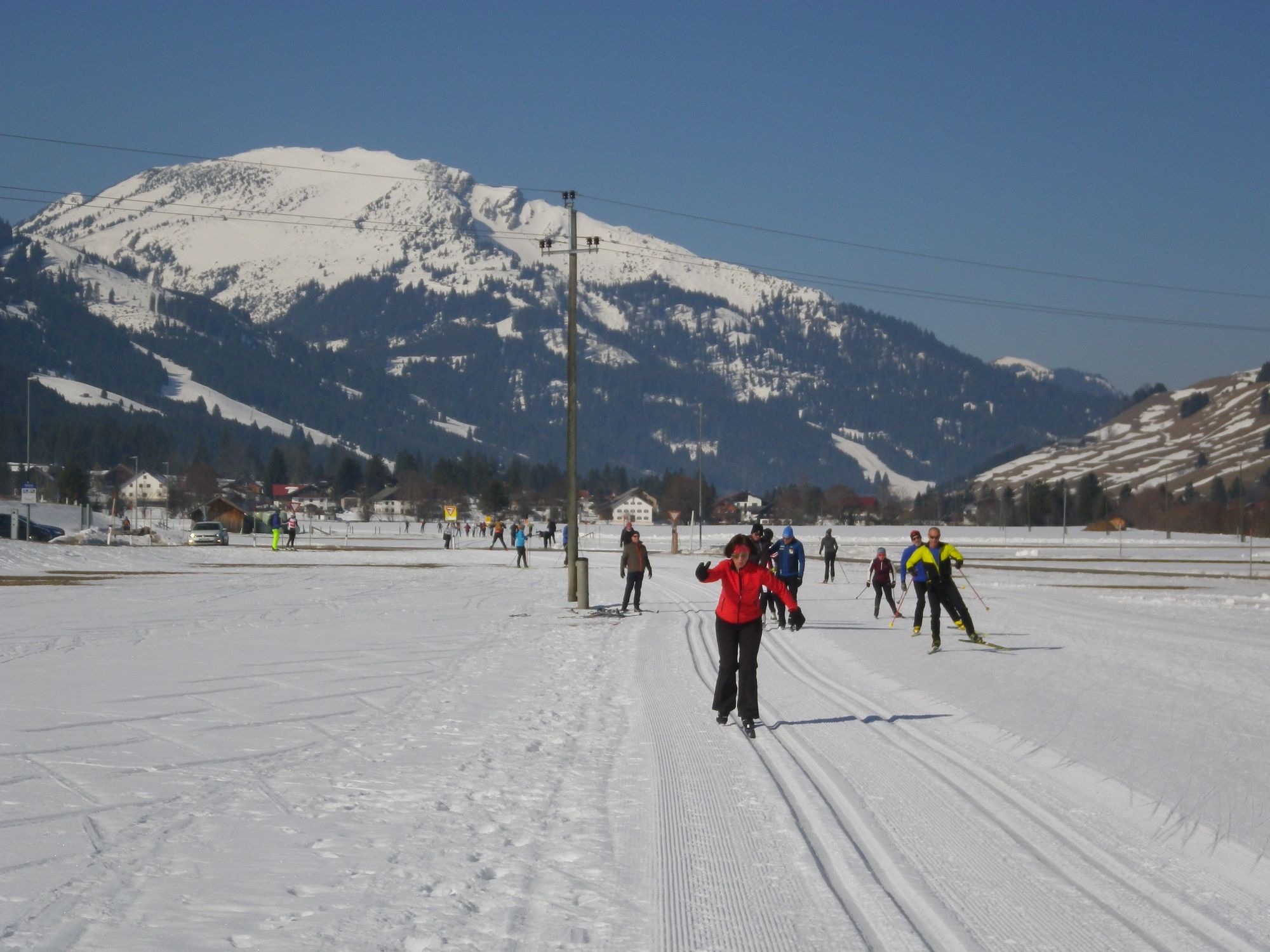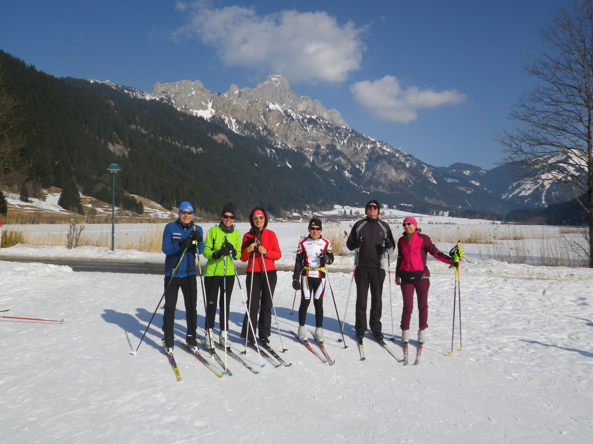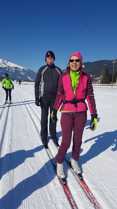 Teilweise wurde dann auf Skating-Ski gewechselt. Auch diese Technik unterrichtete Joachim. Die „Klassiker“ wurden jedoch nicht vergessen. Gemeinsam liefen wir in einer größeren Schleife bis zum Haldensee und zurück. Die Gruppe harmonierte sehr gut, auch ein sehbehinderter Teilnehmer wurde gut integriert, konnte einem Führungsläufer folgen und erhielt stets Informationen zum Verlauf und Zustand der Spur.