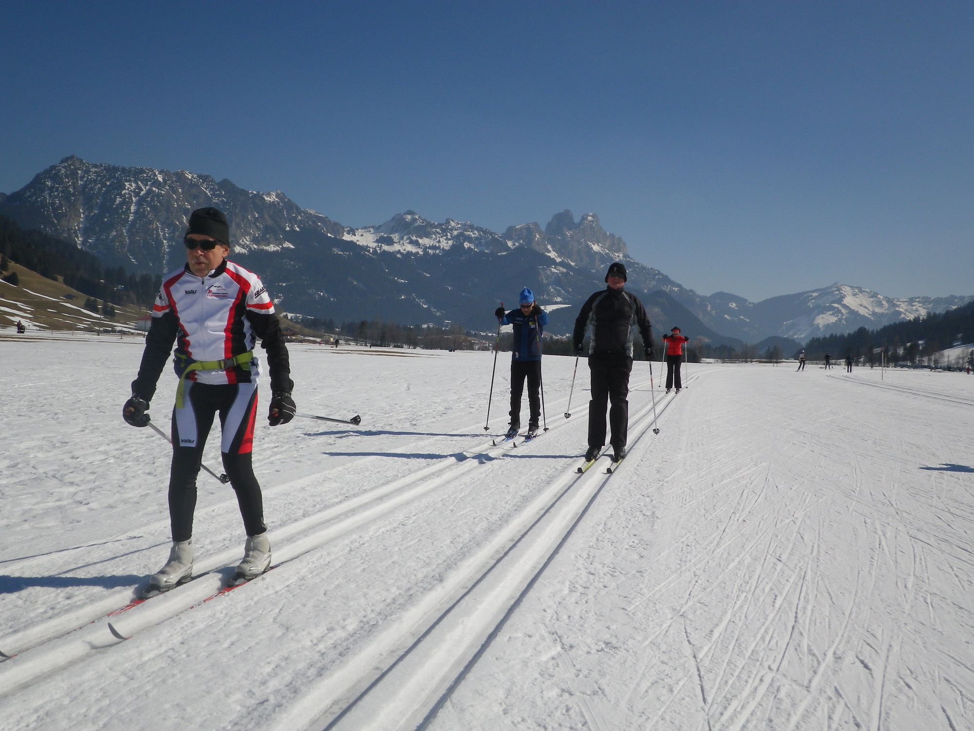 Dort erwartete uns Kaiserwetter. Obwohl recht wenig Schnee lag, waren die Loipen für den Klassischen Stil und Skating breit angelegt und top-präpariert. Nach einem Langlauf-spezifischem Aufwärmprogramm begann der Tag mit Klassik-Training direkt am Parkplatz: Gleichgewichts-, Abstoß- und Gleitübungen ohne Stöcke, zum Teil mit nur einem Ski – zum Teil mit beiden. Nachdem sich jeder ans Gerät gewöhnt hatte, wurden die Stöcke hinzugenommen und die diversen Lauftechniken vermittelt. Joachim hatte ein gutes Auge für alle und gab individuelle Tipps. Kurz vor der Mittagspause wurde dann „Strecke“ gelaufen, bis uns der Hunger in den „Ritter“ trieb, in dem uns leckere Tiroler Spezialitäten für die zweite Tageshälfte stärkten.