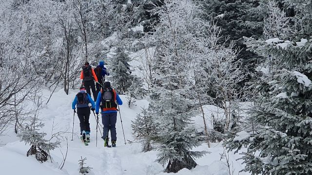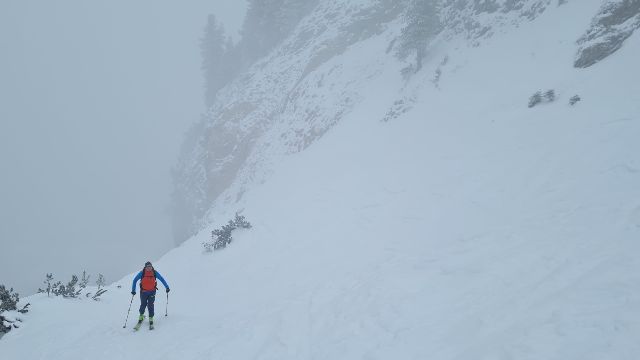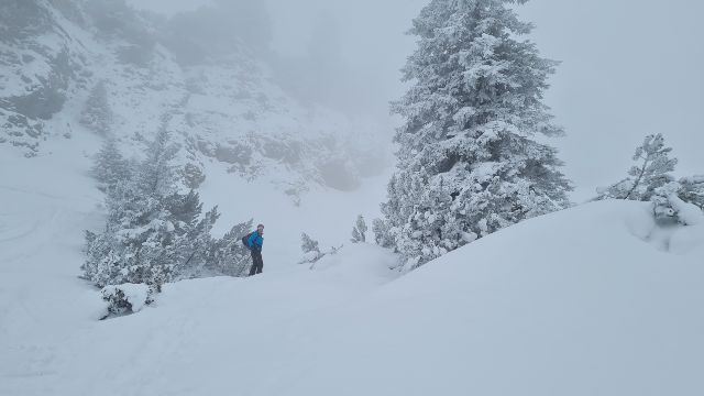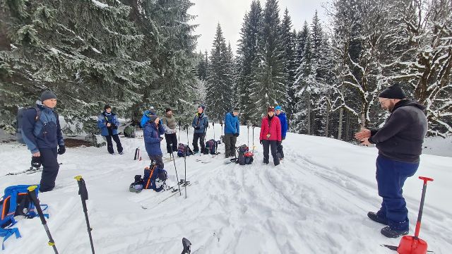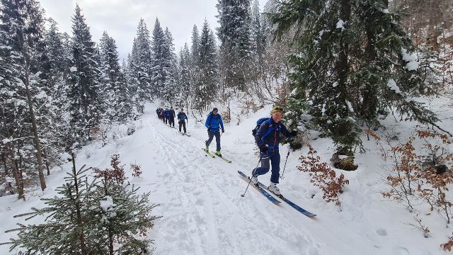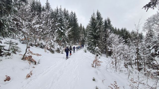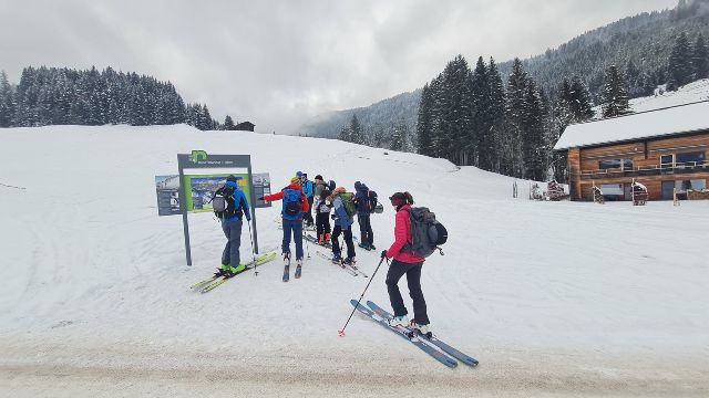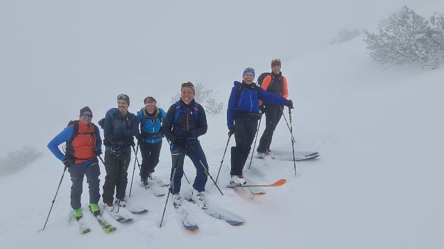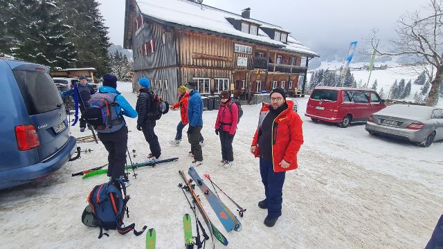 Gegen 9.00 Uhr startete das 11köpfige Tourengespann mit Tourenski und Splitboards Richtung Toreck. Die Skitour auf das Toreck ist ein typisches Ziel für den Hochwinter mit einer üppigen Schneemenge, da sie über weite Strecken durch Waldschneisen, Ziehwege und kupiertes Gelände führt. Die Route wurde zum Schutz der Fauna nach längeren Kontroversen vom DAV ausgeschildert. Hier sind auch Ranger/innen zeitweise vor Ort, um die zunehmende Anzahl an Tourengänger/innen, der coronabedingt starken Zuwachs erfahren hat, zu informieren und zu leiten. Letztendlich ist es somit auch sehr hilfreich, den Weg durch den unübersichtlichen Wald im unteren Bereich des Anstiegs zu finden. Oberhalb der Waldgrenze gelangt man in freies Skigelände, das für die Abfahrt tolle Hänge bietet. Nach oben hin führt schließlich ein plateauartiger Kamm auf die Oberen Gottesackerwände zum Gipfel des Torecks mit phantastischem Blick auf den Allgäuer Hauptkamm bis hinüber zum Säntis – sofern das Wetter es zulässt. Bei Nebel oder Schneefall ist die Orientierung im oberen kupierten Gelände sehr schwierig, deshalb sollte eine gute Sicht gewährleistet sein. Darunter befindet sich ein 30 bis 35 Grad steiler Hang, der bei kritischer Lawinenlage oder Vereisung vorsichtig anzugehen ist. Und der Nebel war es, der die Gruppe vom Start weg immer begleitete und nach oben hin stetig zunahm. So waren die ersten 200 Höhenmeter schnell geschafft und auf einer größeren Schneefläche fand ein ausführliches LVS-Training statt, so dass auch Einsteiger/innen mit den lebenswichtigen Maßnahmen vertraut gemacht werden konnten. Nach weiteren 300 Höhenmetern öffnete sich der Wald und eine milchig-weiße Umgebung konnte wahrgenommen werden, da der Nebel stetig zunahm. Dennoch konnte entlang der steilen Felswände ein weiterer Höhenunterschied von 280m begangen werden, bis nach in Summe 780 Höhenmetern und somit ca. 120 Höhenmeter vor dem Gipfel die Entscheidung getroffen wurde, die Tour zu beenden und die sichere Rückkehr ins Tal anzutreten. Die Nebelwand war mittlerweile so dicht geworden, dass nur noch ein einheitliches Weiß in allen Richtungen zu erkennen war. Eine Sichtweite von maximal 3-5 Metern zwang daher zum Abfellen der Schneesportgeräte und die vorsichtige Abfahrt ins Tal. Hier traf die Gruppe vollständig und unverletzt ein, so dass ein schöner Ausklang des Tourentages im DAV-Mahdtalhaus, mit Knoblauch- und Maultaschensuppe sowie selbst gemachtem Kirschkuchen und Kaffee genossen werden konnte. Und dennoch waren alle Teilnehmer/innen zufrieden über die sportliche Betätigung und einen schönen Frischlufttag in der tollen Natur im Gebiet des Torecks. Ein Dank geht in diesem Zusammenhang an unsere beiden Tourenguides der Abteilung Outdoorsport im TV Stammheim, die die Tour geplant und alle Tourengeher/innen mit in die tolle Winterlandschaft genommen haben.