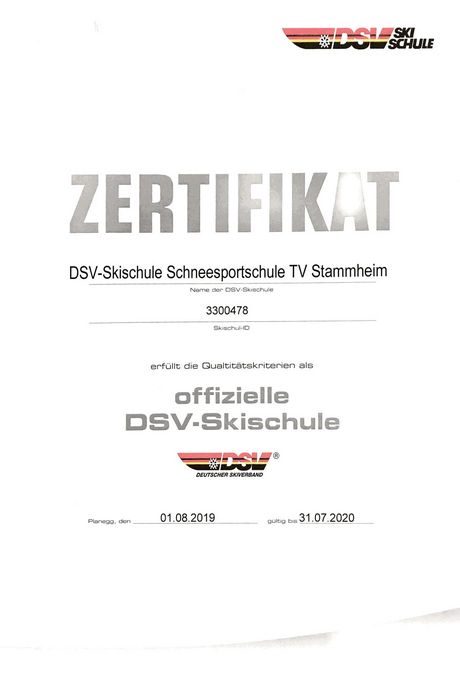 Im Rahmen des jährlich stattfindenden Rezertifizierungsprozesses konnte die Schneesportschule auch weiterhin die entsprechenden Voraussetzungen erfüllen, um das DSV-Zertifikat überreicht zu bekommen. Damit wird erneut bestätigt, dass der Unterricht in der Schneesportschule - durchgeführt von qualifizierten Übungsleiter/innen, die in den entsprechenden Disziplinen ausgebildet wurden - die anspruchsvollen Kriterien an eine DSV-Skischule erfüllt.