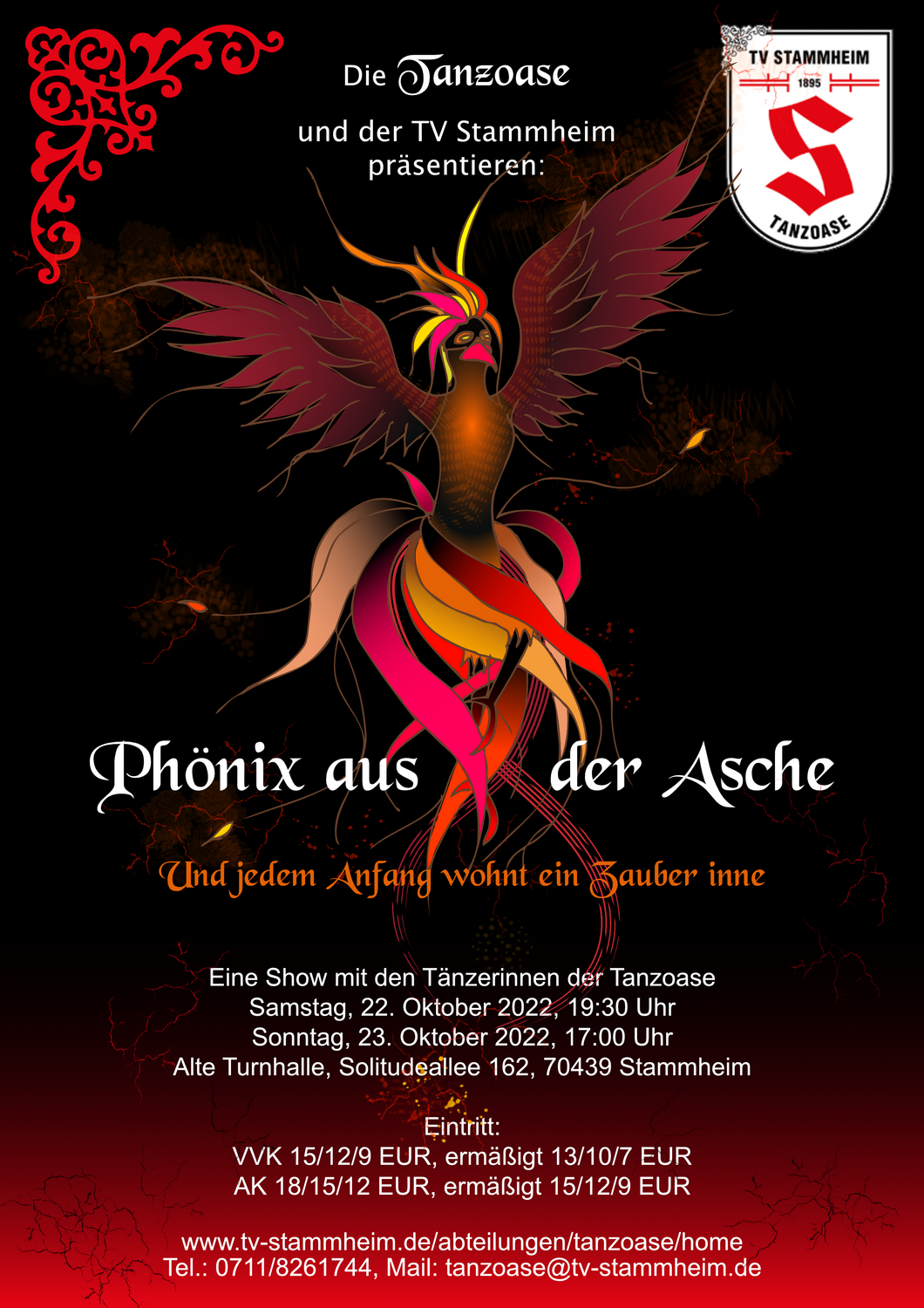 Mit dieser Show wollen wir noch einmal das Szenario des Brandes vom August 2019 in Erinnerung rufen und tänzerisch aufarbeiten. Der Phönix entfaltet in unserer Show seine Flügel und steigt aus der Asche. Er führt uns in eine hoffentlich gute Zukunft.