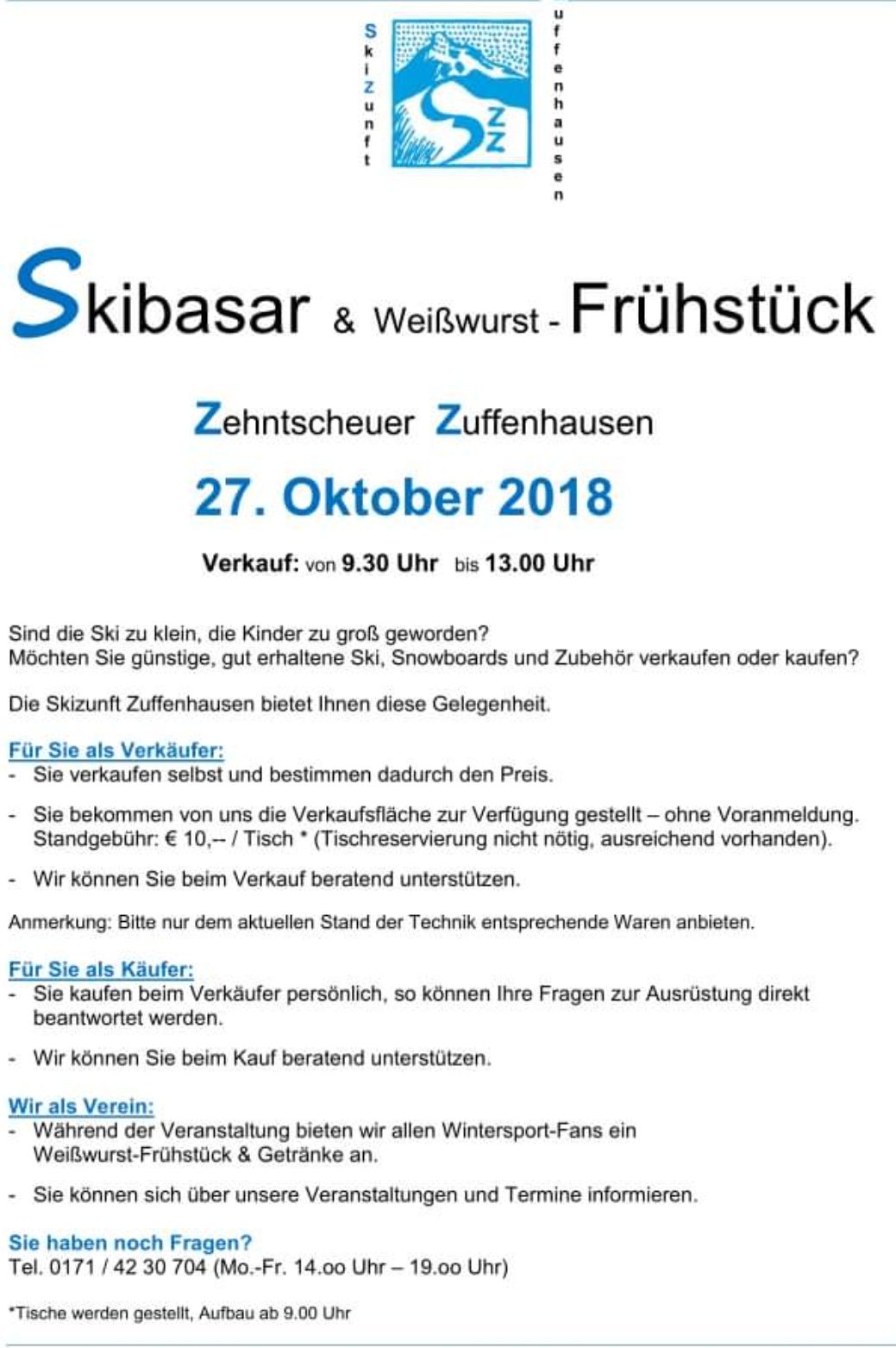 In der Zuffenhäusener Zehntscheuer findet der Skibasar mit Weißwurstfrühstück statt. Für die Käufer werden Fragen vor Ort direkt vom Verkäufer beantwortet; das Team der Skizunft Zuffenhausen steht zudem für fachkundige Beratung zur Verfügung.
