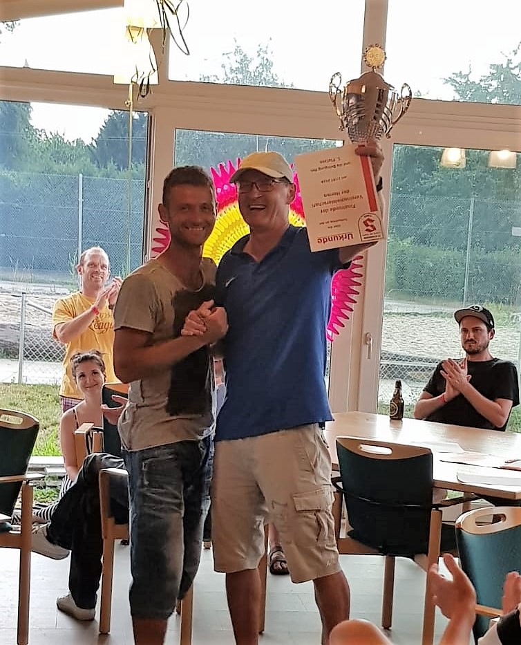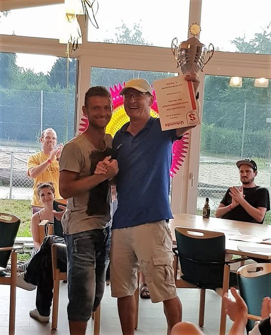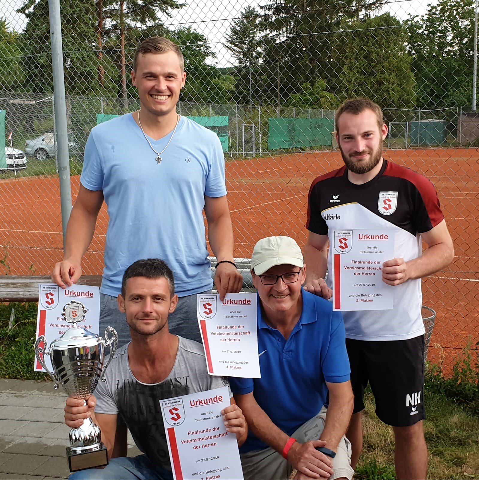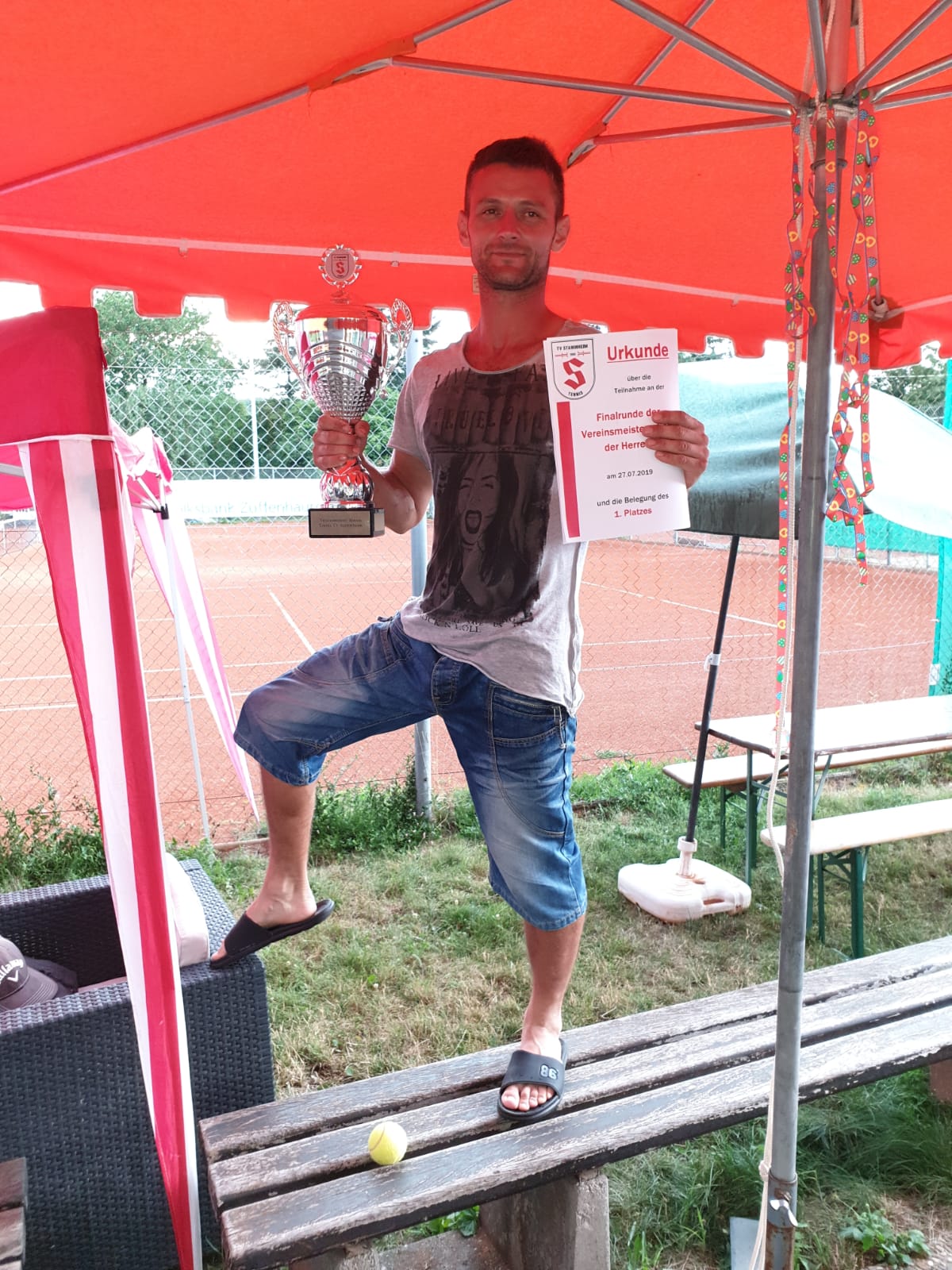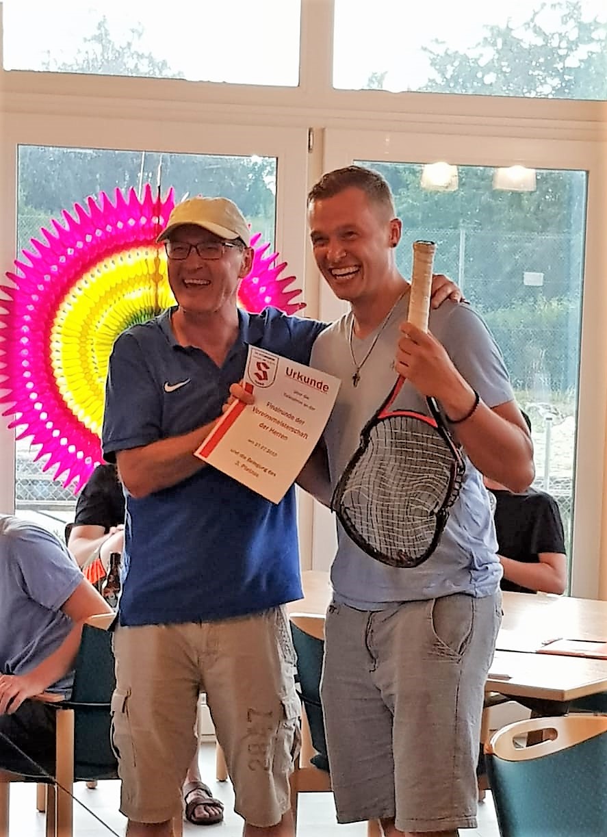 Im Finalspiel zwischen Kris und Niki deutete sich ein ähnlich schnelles Ende an, nachdem Kris den ersten Satz mit 6:1 für sich verbuchen konnte. Nachdem die ersten Unsicherheiten dann aber abgelegt werden konnten, wurde der zweite Satz doch noch wesentlich spannender, indem Niki zwischenzeitlich sogar mit 3:2 in Führung gehen konnte. Dies hielt allerdings nicht lange an und Kris führte dann beim nächsten Seitenwechsel wieder mit 4:3. Doch dann wurde es noch einmal sehr dramatisch und wirklich alle, egal ob Zuschauer oder Spieler kamen hier nochmal voll auf ihre Kosten. Bei diesem folgenden Aufschlagspiel von Kris stand es nach einigen harten Punkten 40:40 (Einstand) und es folgten nervenaufreibende Minuten für alle. Man hatte das Gefühl das keiner der beiden Spieler, dieses Spiel für sich entscheiden wollte, denn es ging eine gefühlte Ewigkeit hin und her. Nachdem immer mal wieder einer der beiden mit Vorteil in Führung ging, wollte dann jeweils der entscheidende Punkt nicht gelingen und es ging minutenlang und geschätzte 20-25 mal wieder über Einstand. Doch letztendlich konnte Kris sein Aufschlagspiel halten und zog so mit 5:3 davon. Aber Niki gab sich noch nicht auf und sicherte sich ebenfalls sein Aufschlagspiel, sodass nochmals die Seiten gewechselt wurden. Im darauf folgenden Aufschlagspiel von Kris ließ er dann allerdings nichts mehr anbrennen und sicherte sich den Sieg mit 6:1 6:4 und damit den Titel als Vereinsmeister der Herren 2019.