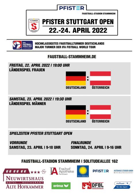 Am Samstag und Sonntag geht es dann bei den Frauen und Männer um Weltranglistenpunkte, im Teilnehmerfeld sind Teams aus Deutschland, Österreich und der Schweiz vertreten. Nahezu alle Topteams der europäischen Faustballszene werden in Stammheim ihren Leistungsstand unter Beweis stellen.
