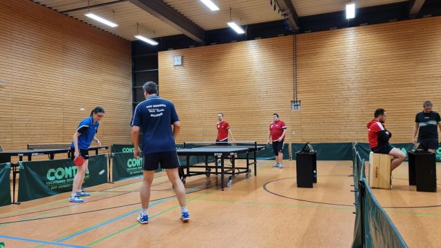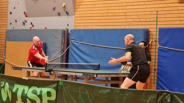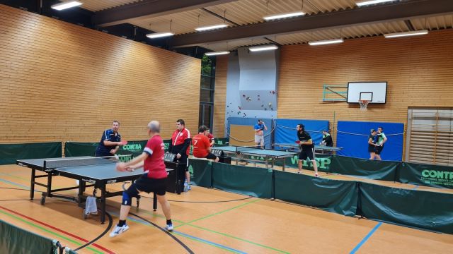 Die Mannschaft der Herren II bestritt zeitgleich ihr Punktspiel in der Stammheimer Turnhalle. So konnte ein furioser Start gelingen und alle drei Eröffnungsdoppel auf der Habenseite des Stammheimer Teams verbucht werden. Auch die folgenden Einzelspiele direnten dazu, den zwischenzeitlichen Spielstand für die Herren II auf 6:2 auszubauen. Doch dann folgte eine Schwächeperiode in den folgenden fünf Einzelspielen, die allesamt an das Team aus Münster gingen, so dass nunmehr 6:7 aus Stammheimer Sicht auf der Anzeigetafel zu lesen war. Es folgten die beiden letzten Einzel des abends, die Stammheim für sich entscheiden konnte ; die Entscheidung musste im Schlussdoppel fallen. Hier gelang zunächst den Münsteranern der bessere Start und sie zogen mit 2:0 Sätzen davon. Doch Schüo/ Schmidt bewiesen Moral und erspielten sich mit taktischer Cleverness die folgenden beiden Sätze: Zwischenstand 2:2. Das Spiel musste im Entscheidungssatz seinen Sieger finden. Enge Ballwechsel und tolle Leistungen waren nun auf beiden Seiten zu sehen. Allen Spielern wurde körperlich und mental um 22.45 Uhr nochmals alles abverlangt, was Tischtennis ausmacht. Am Ende ging der Entscheidungssatz mit 12:10 an das Team aus Münster, so dass um 23.00 Uhr der Gesamtspielstand auf der Anzeigetafel mit 8:8 zu lesen war – Punkteteilung.