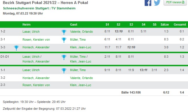 Mit einem deutlichen 4:1 nach Spielen und 12:6 nach Sätzen konnten sich die Tischtennis-Herren I direkt für die nächste Pokalspielrunde qualifizieren. So zeigten die Spieler Valente, Müller und Klein eine ordentliche Leistung an der Tischtennisplatte und konnten nach 75 Minuten als Sieger das Spielfeld verlassen. Herzlichen Glückwunsch und weiter so!