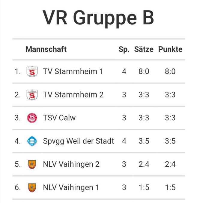 Stammheim 1 setzte sich standesgemäß in allen Spielen gegen die eigene Zweite, Calw, sowie NLV Vaihingen 1+2 jeweils mit 2:0 durch.
