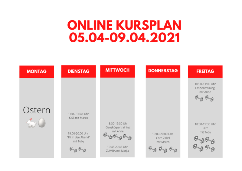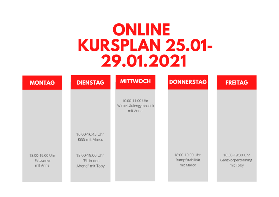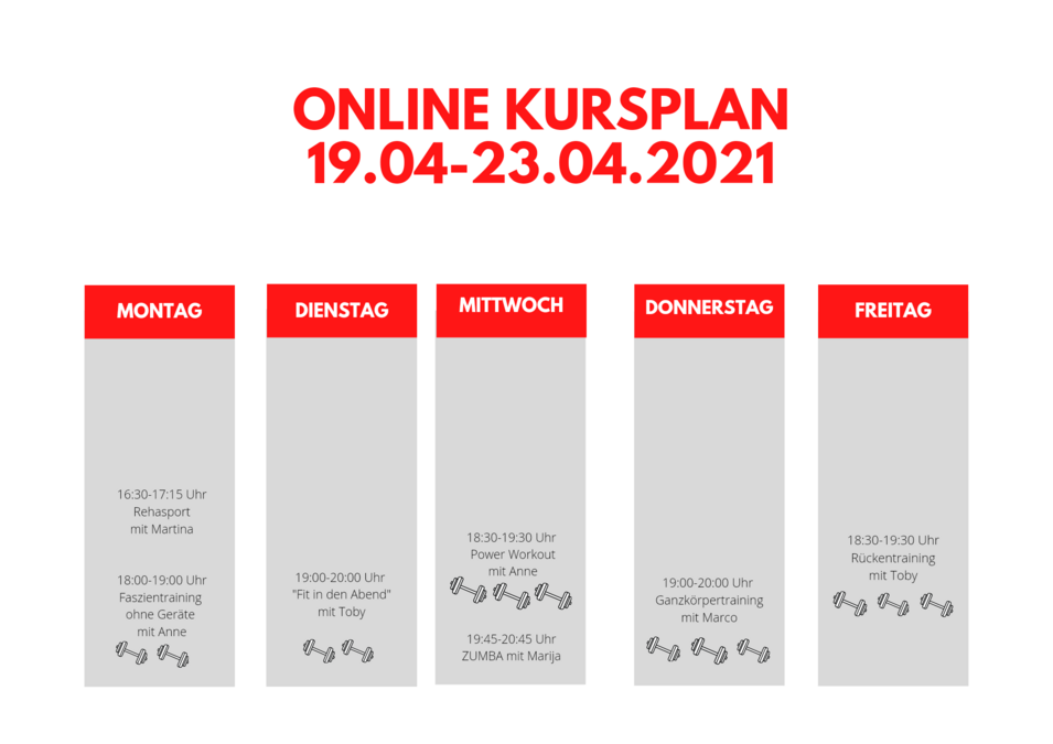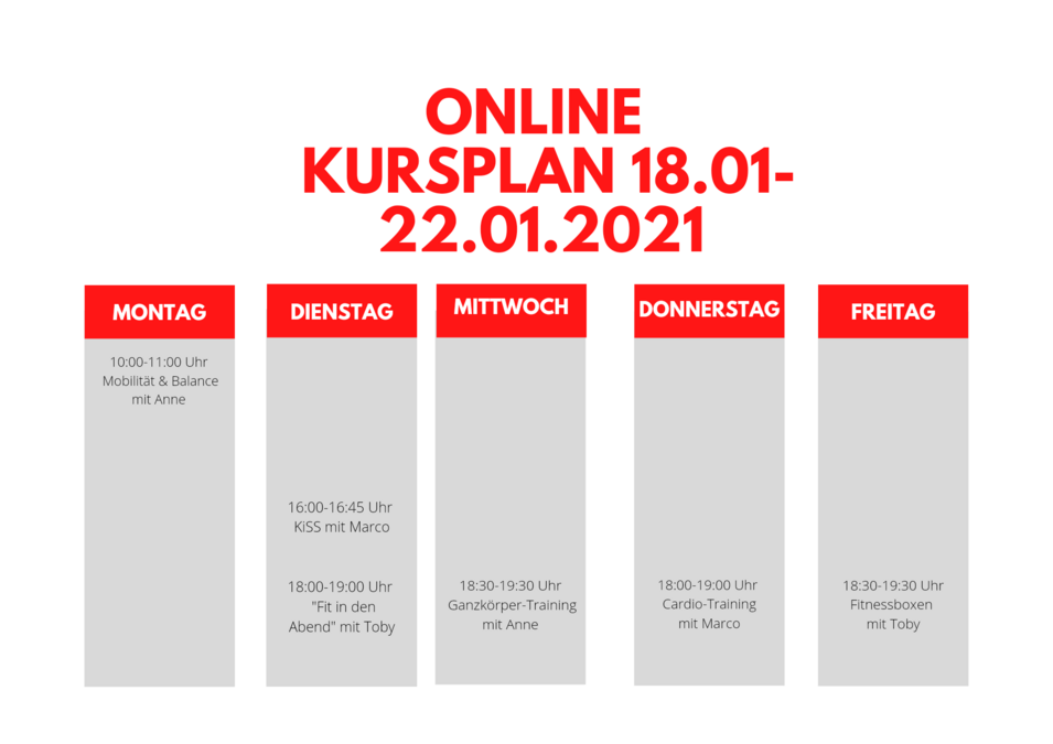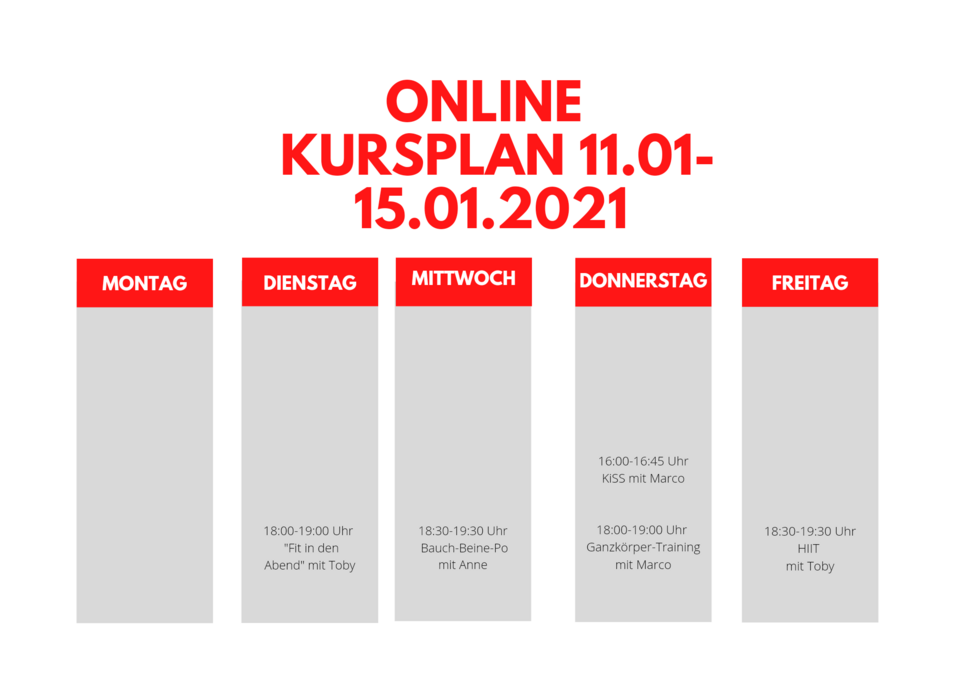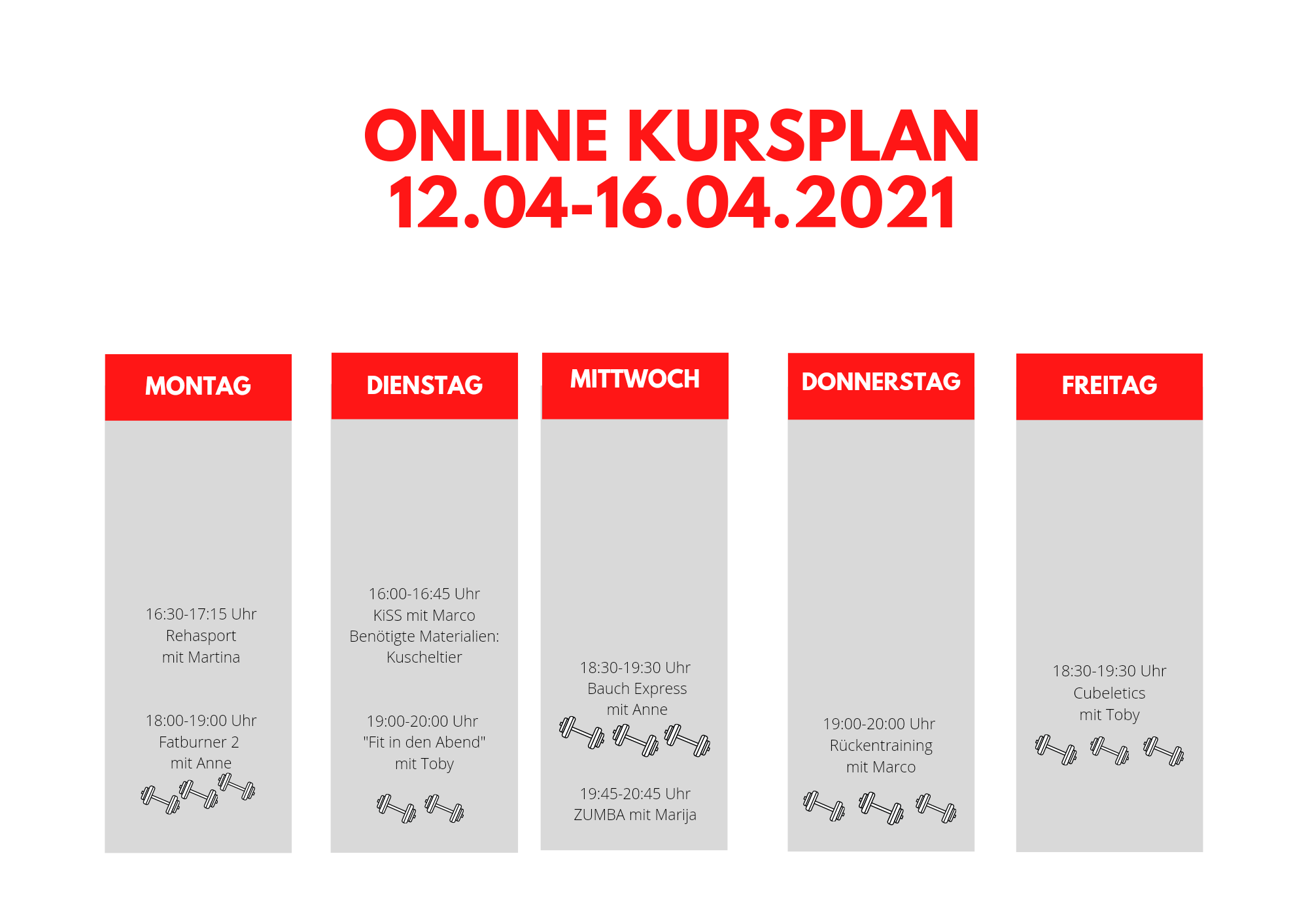 In der Grafik findet ihr den aktuellen Kursplan für diese Woche: Klickt Euch rein und trainiert den Weihnachtsspeck weg!