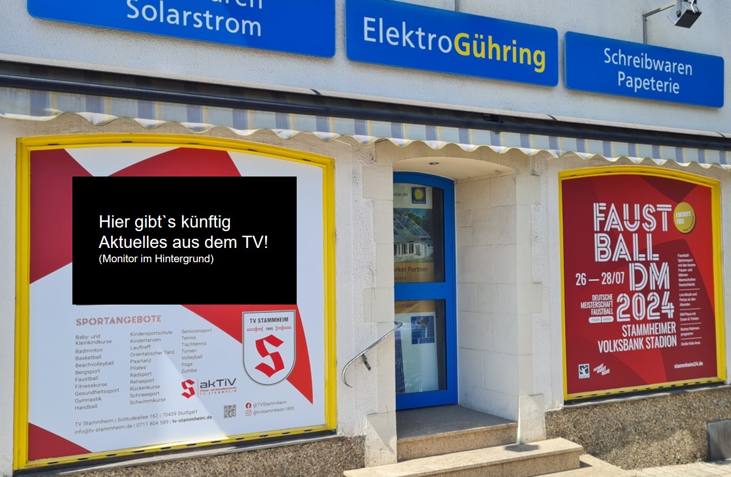 So finden sich in den Schaufenstern der Fa. Gühring, zwei Informations- und Werbeflächen des TV Stammheim. Auf der linken Seite zeigt eine Übersicht das vielfältige Breiten- und Leistungssportangebot des TV Stammheim. Darüber hinaus findet sich hier ein Monitor eingebettet, der regelmäßig aktuelle Informationen bereithält.